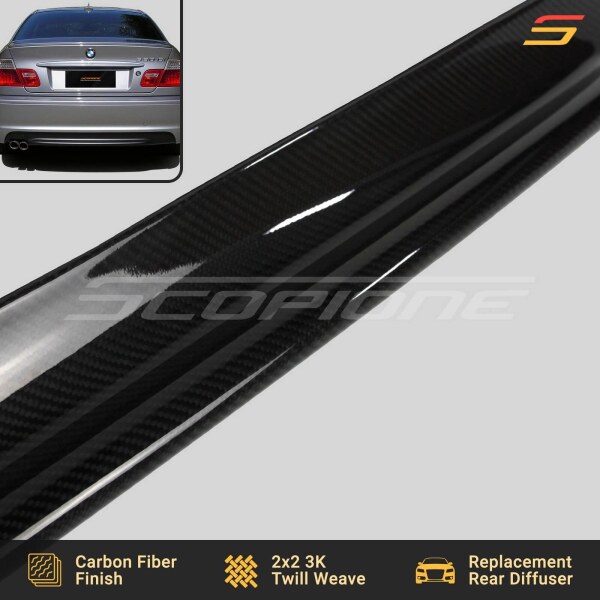 Looking for the perfect visual upgrade for your BMW E46? Genuine Scopione Carbon Fiber parts will add a distinct style to your super car that can only be achieved with authentic Carbon Fiber. Authentic carbon fiber rear bumper replacement diffuser is designed for reduction in weight and an increase of performance. The UV and weather protective glossy coating and precise custom fitting of each Scopione Carbon part ensures the driver that the vehicle is equipped with only the most reliable parts available on the market.