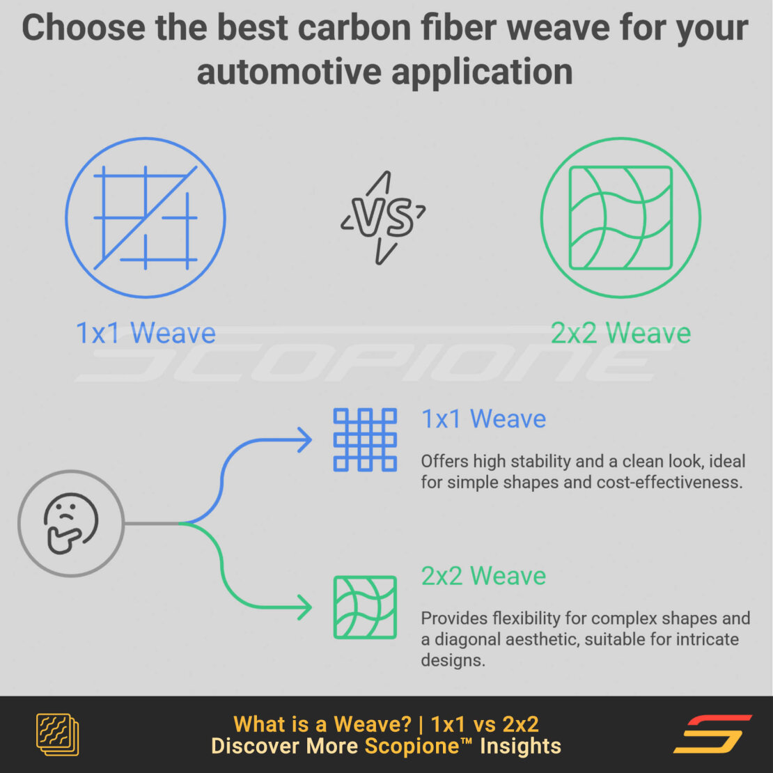 The term “weave” refers to the pattern formed when carbon fiber strands, called tows, are woven into a fabric. Each weave style affects not only the look of the finished part but also its strength, flexibility, and best applications. Knowing the differences helps you choose the right material for both performance and appearance.