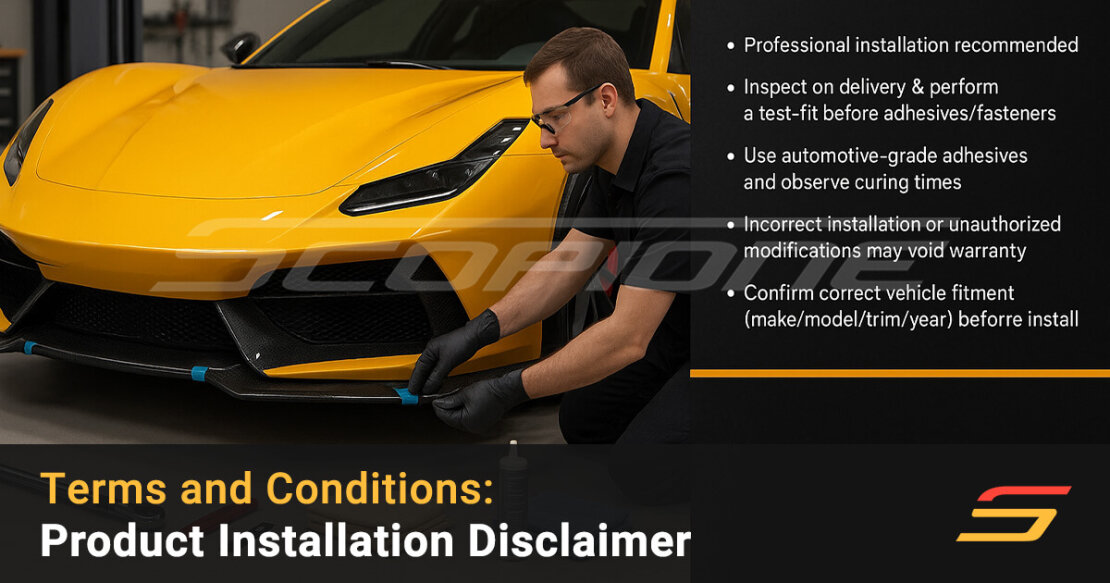 - Fitment Disclaimer: Some parts may require professional fitting, adjustment, or trimming. Scopione.com is not responsible for damage caused by improper installation or misuse. For best results, we recommend installation by a qualified automotive professional familiar with composite materials.